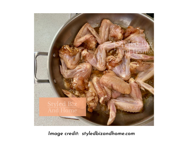 - Add the chicken wings and toss until they are well coated in the sauce.